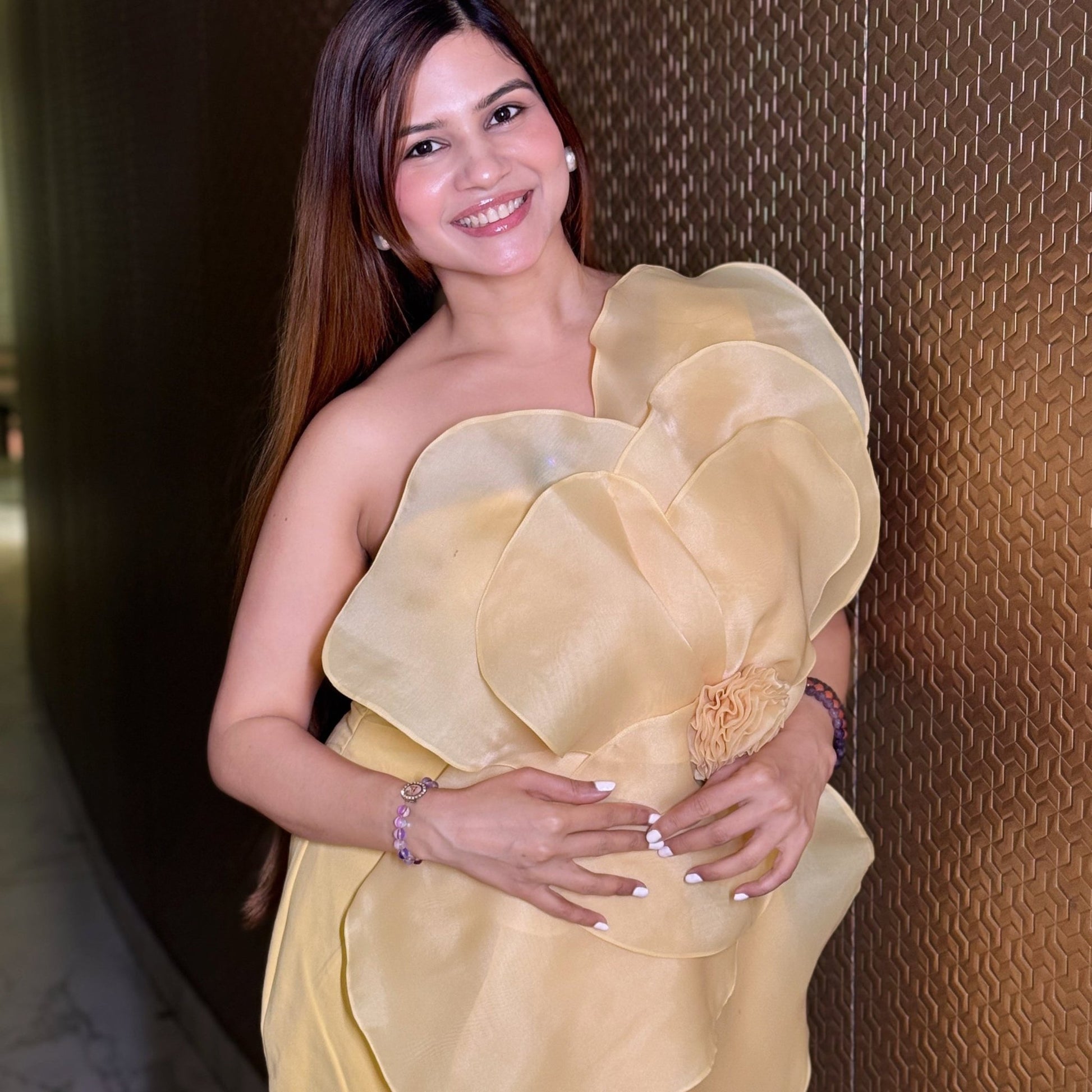 A charming yellow dress inspired by the soft petals of a primrose flower. The layered organza detailing forms a graceful floral motif at the front, adding a touch of delicate artistry. Light, elegant, and full of sunshine warmth — a perfect blend of poise and modern femininity.