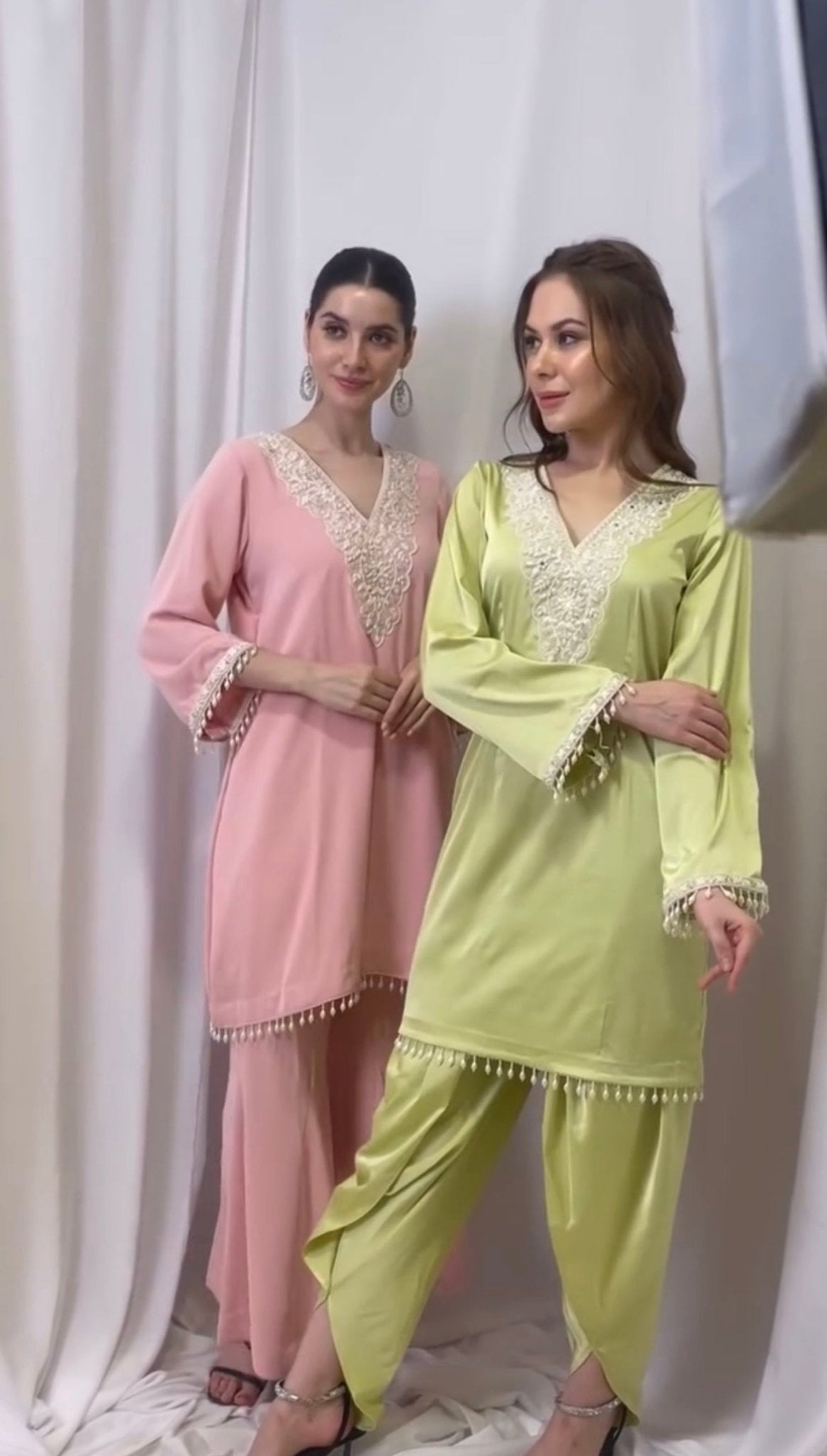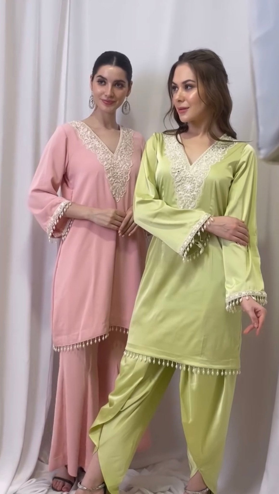Shop our soft kurta set featuring intricate lace embroidery on the neckline and dainty pearl tassel detailing on the hem and sleeves. Paired with flowy palazzo pants, the perfect balance between feminine grace and festive charm.