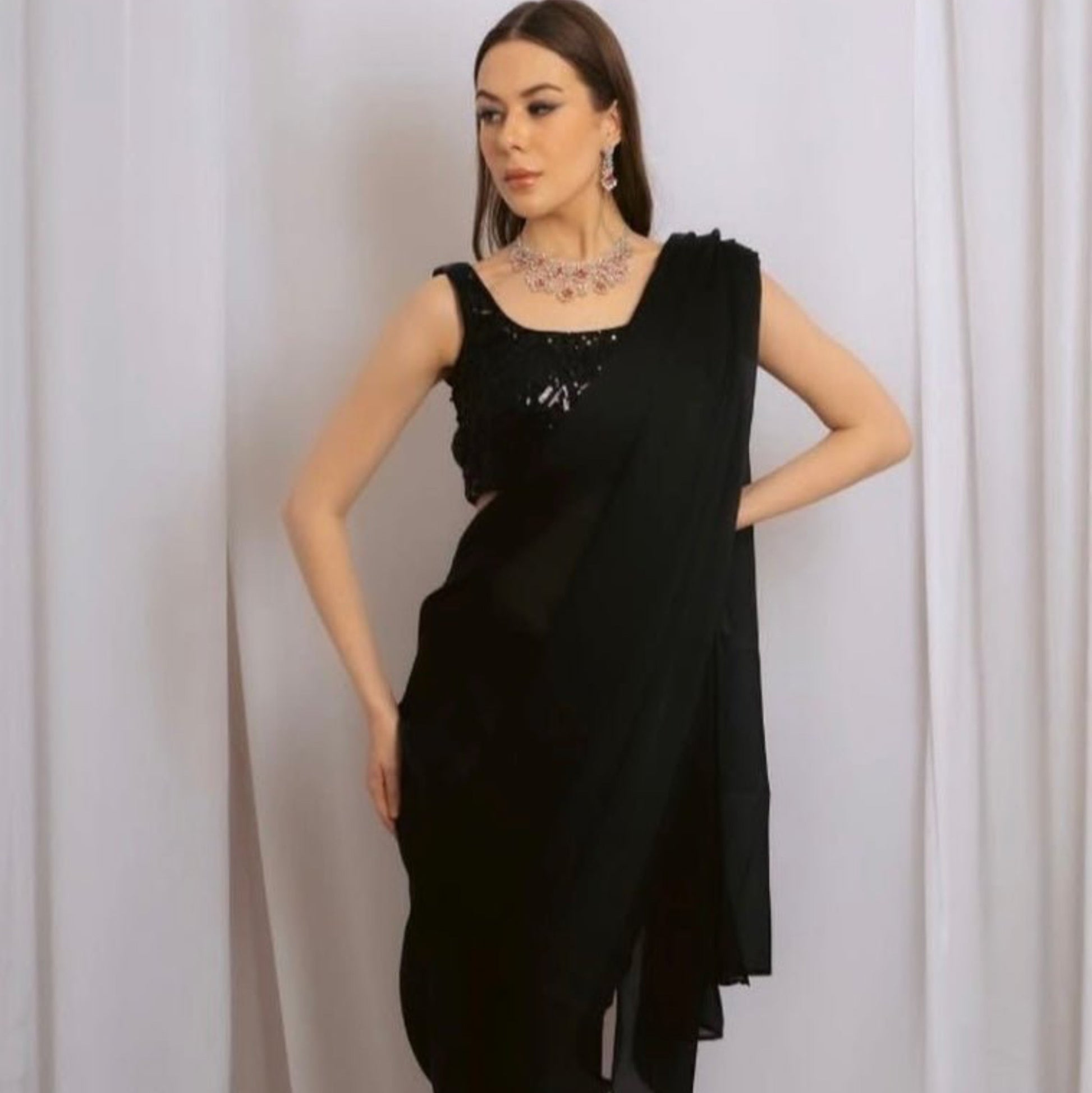 Painted in the timeless hues of black and absolute sophistication, drape yourself in the allure of midnight elegance with our exquisite "EZRA SAREE"