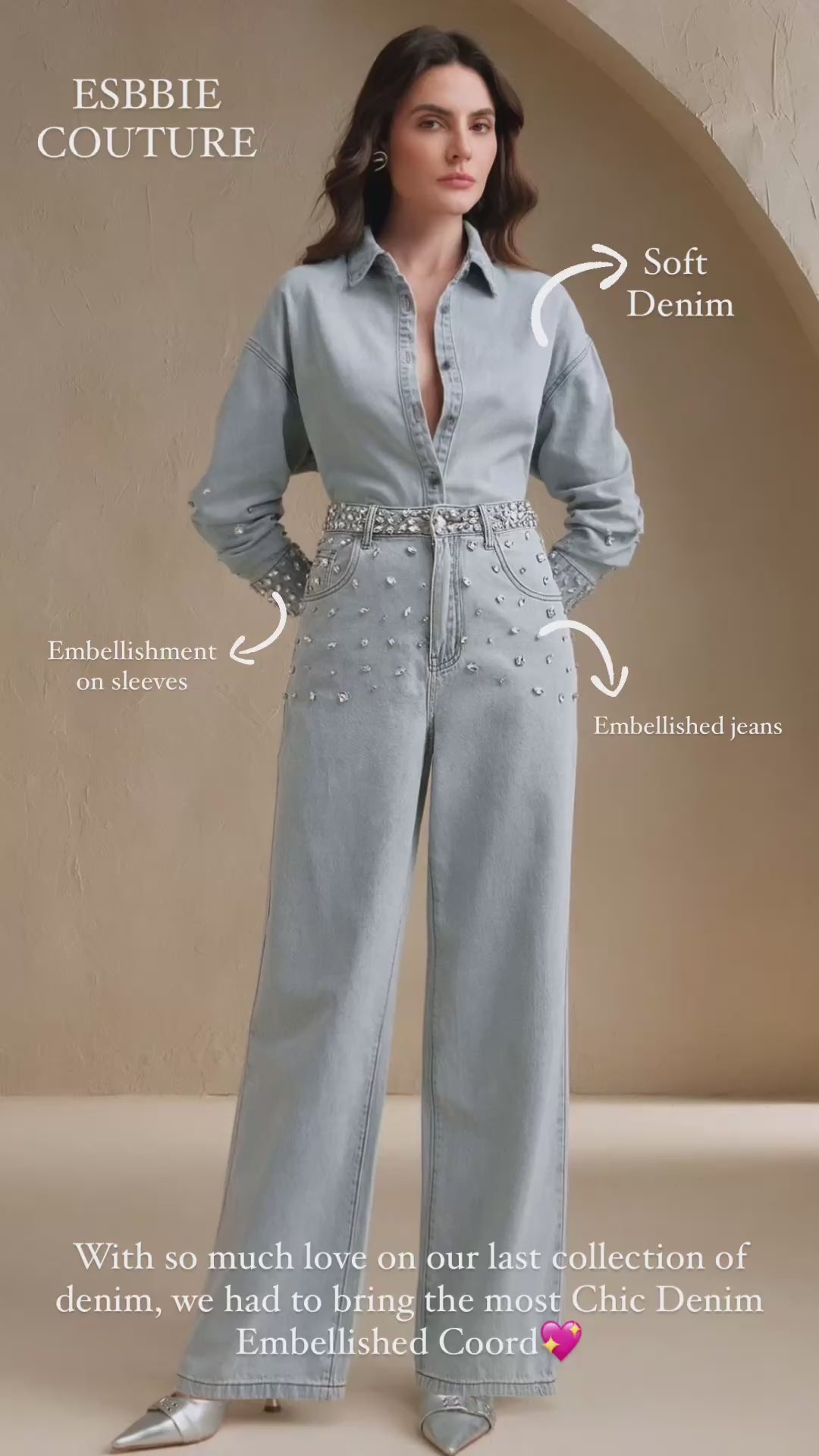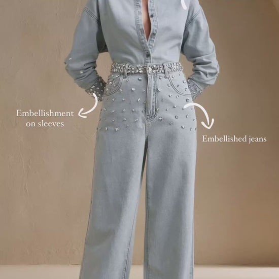 A refined denim shirt and pant set detailed with luminous crystal accents along the cuffs and waistline. This coord brings together sharp tailoring and subtle sparkle, making it the perfect balance of casual sophistication and statement glamour.